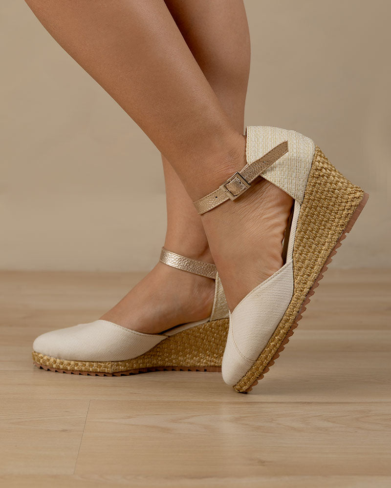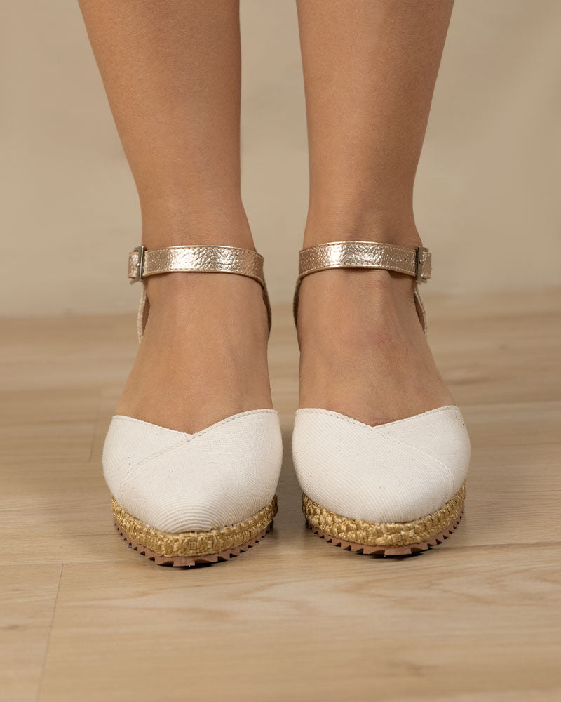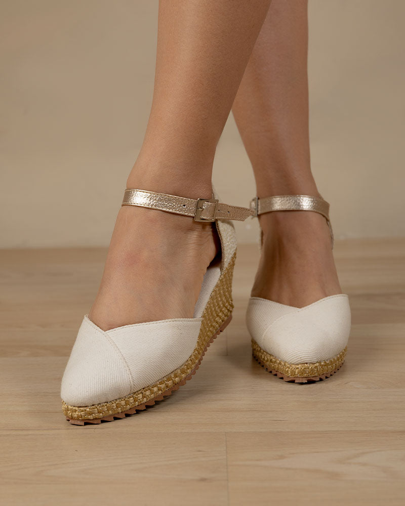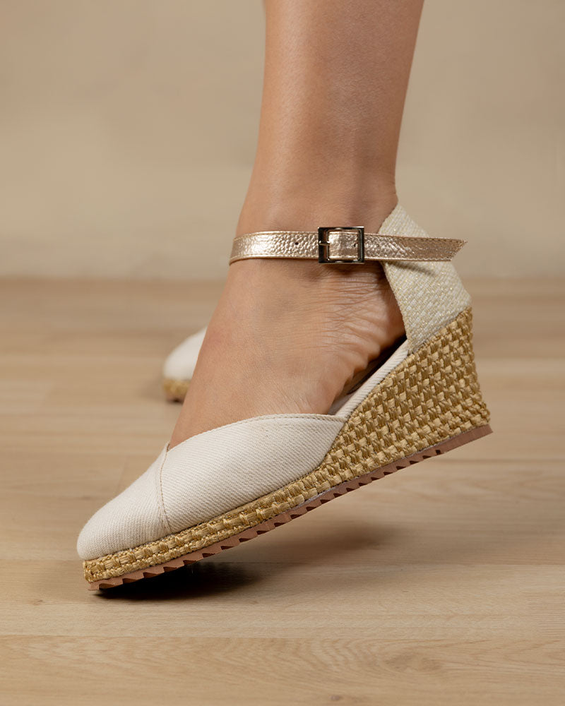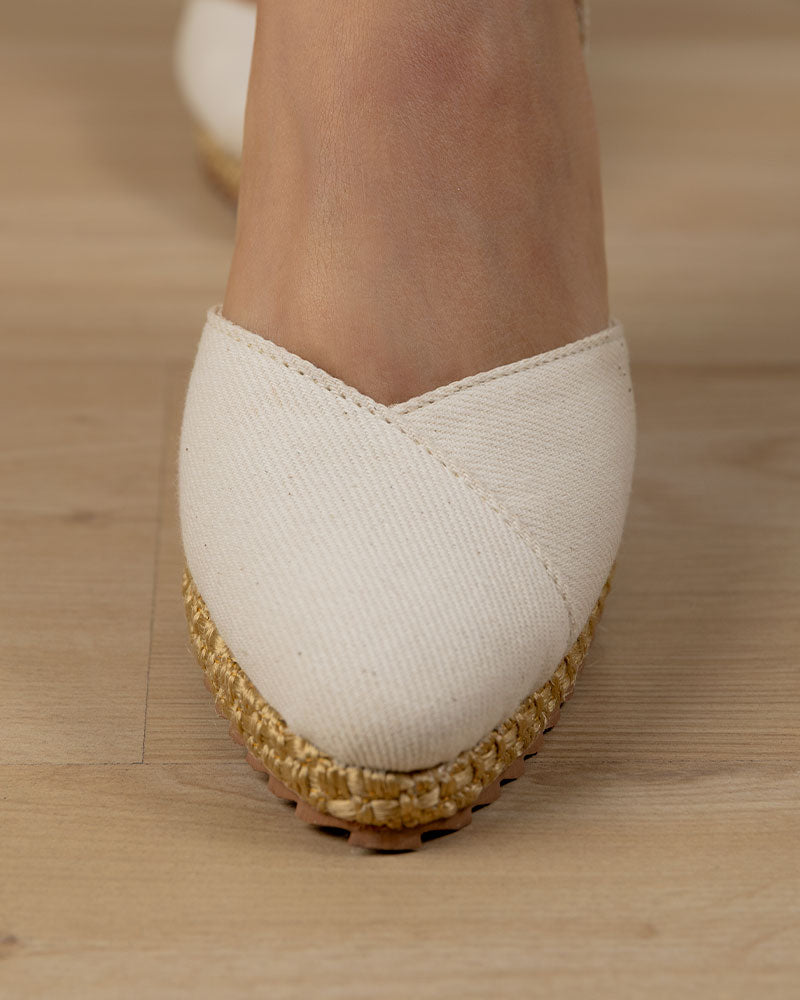 Zapatos elaborados en lona color crudo o natural, altura playa de 5.5cm forrada en yute, suela antideslizante, correita en cuero.
