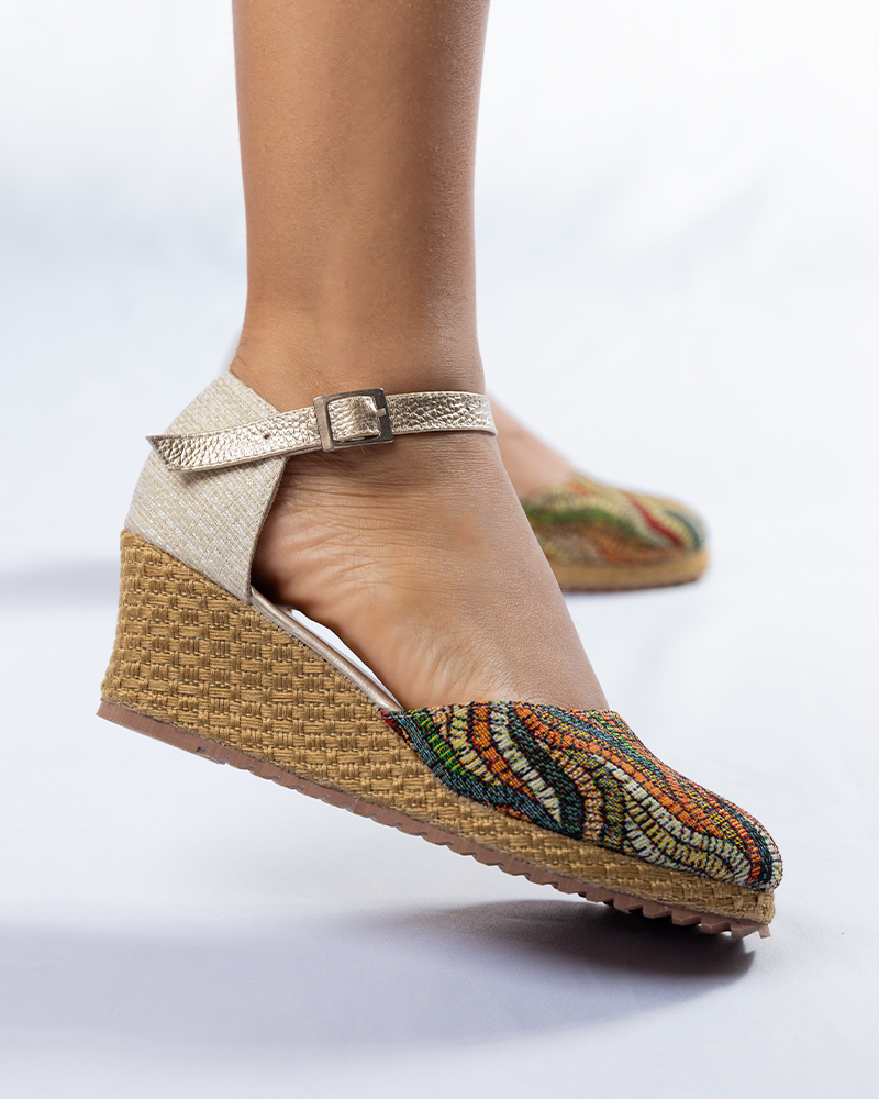 Zapatos elaborados en gobelino en colores, altura playa de 4.5cm forrada en yute, suela antideslizante, correita en cuero.
