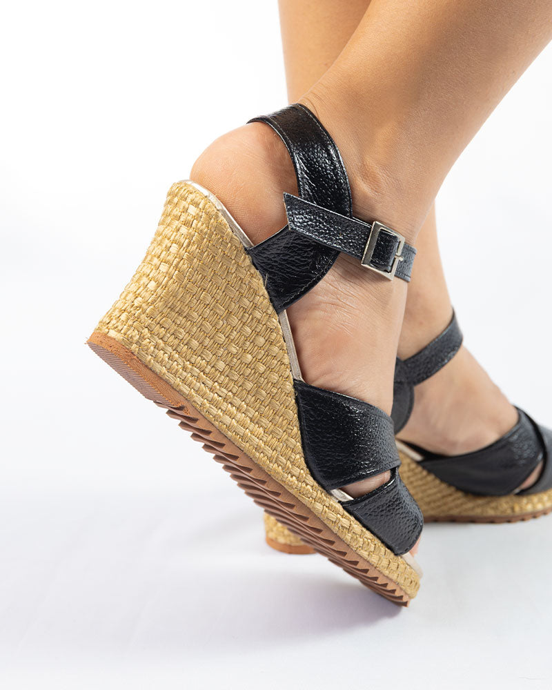 Zapatos elaborados en cuero negro, altura playa plataforma de 6.5cm forrada en yute, suela antideslizante, correita en cuero a tono.