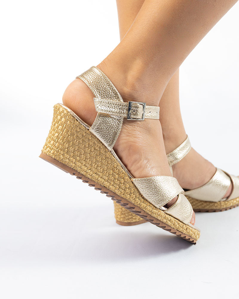 Zapatos elaborados en cuero dorado, altura playa plataforma de 4.5cm forrada en yute, suela antideslizante, correa en cuero a tono.