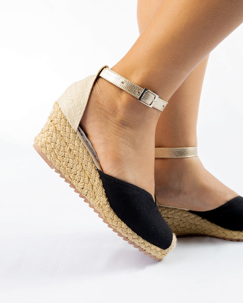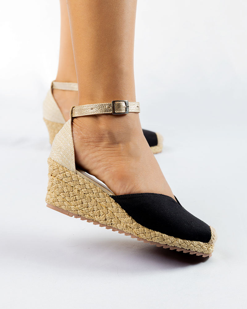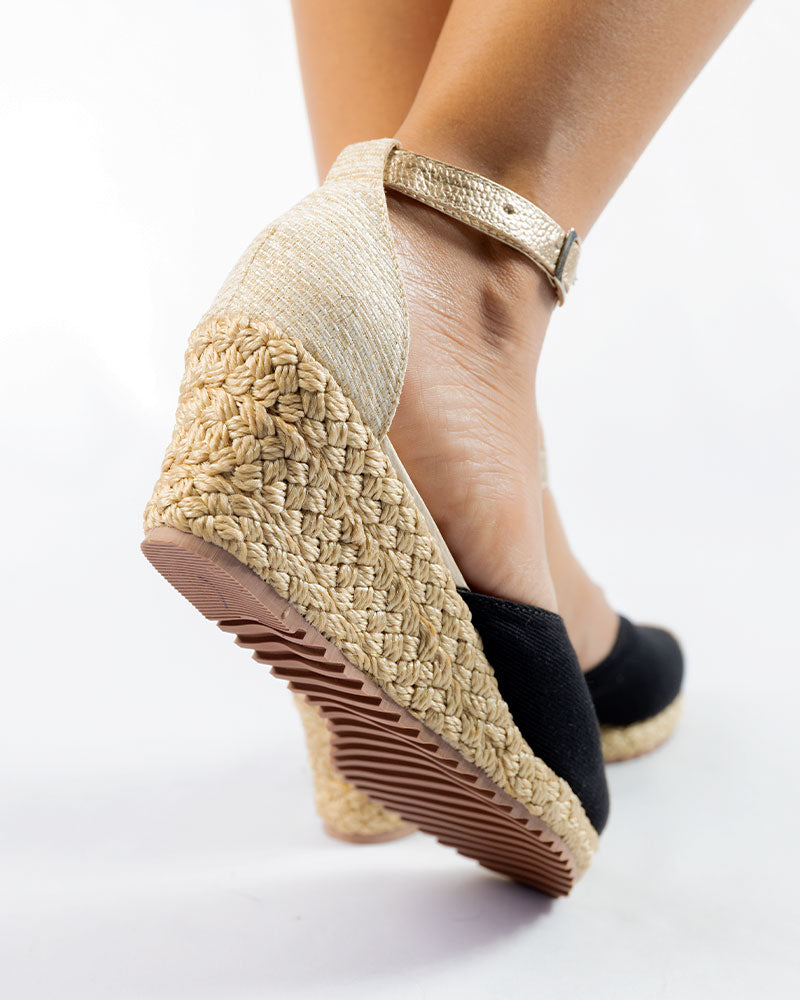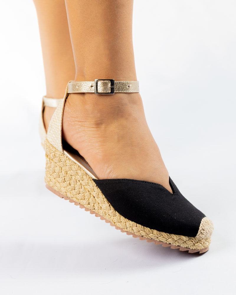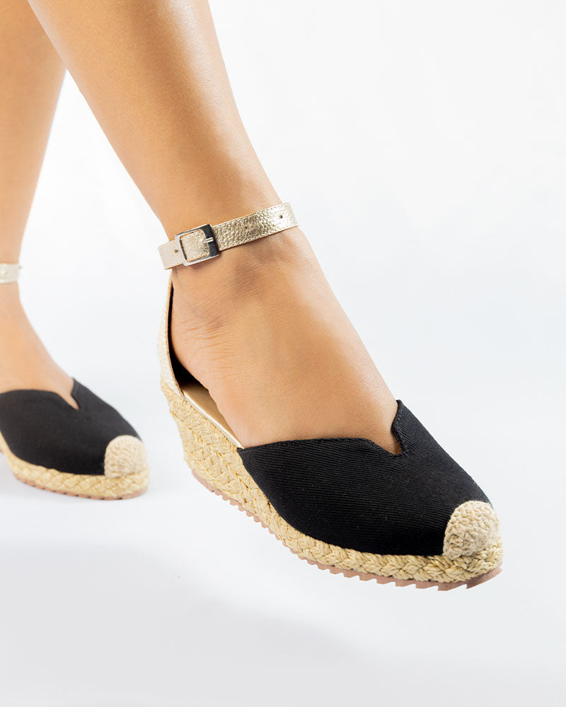 Zapatos elaborados en lona negra con puntera tejida a mano, altura playa plataforma de 4.5cm forrada en trenza de yute, suela antideslizante, correa en cuero a tono con hebilla antioxidante.