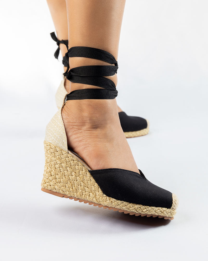 Zapatos elaborados en lona negra con puntera tejida a mano, altura playa plataforma de 6.5cm forrada en trenza de yute, suela antideslizante. Úsalos con cintas o correita, te enviamos ambas opciones.